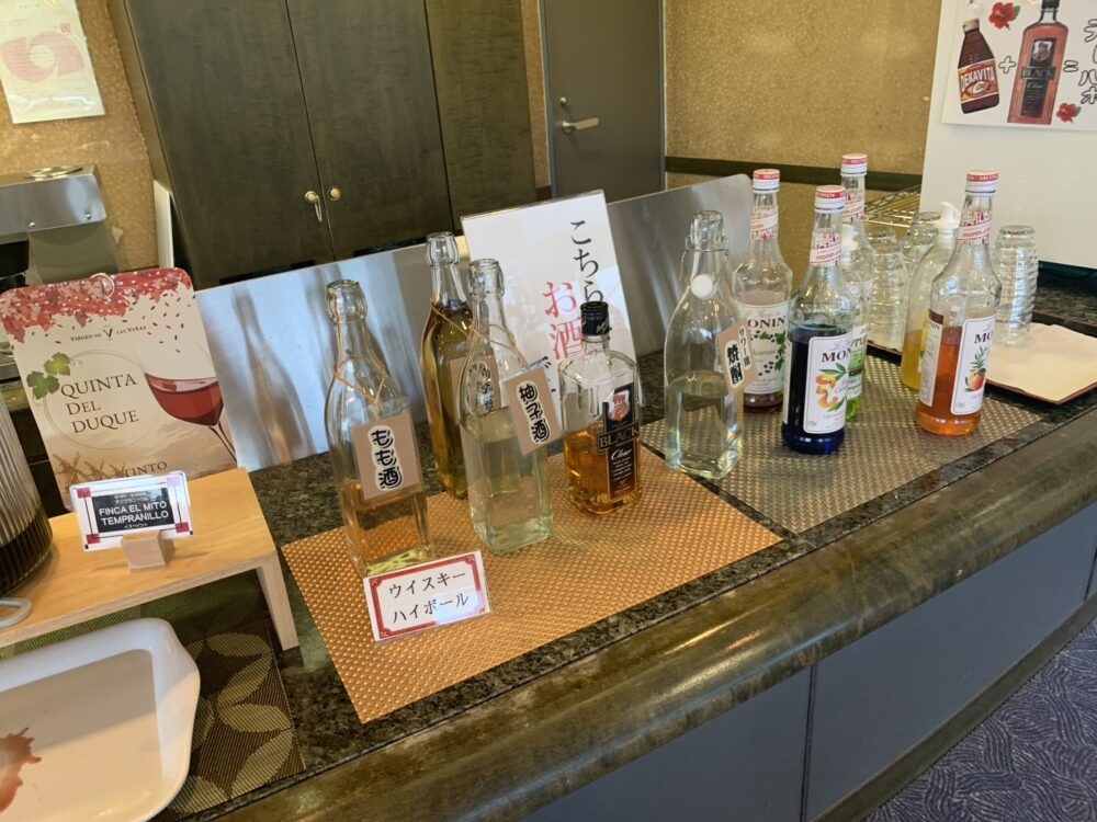 ホテル浬ではなんとウェルカムドリンクから割と豊富なお酒やおつまみなどのお菓子が食べられます。このはからいは嬉しいですね!