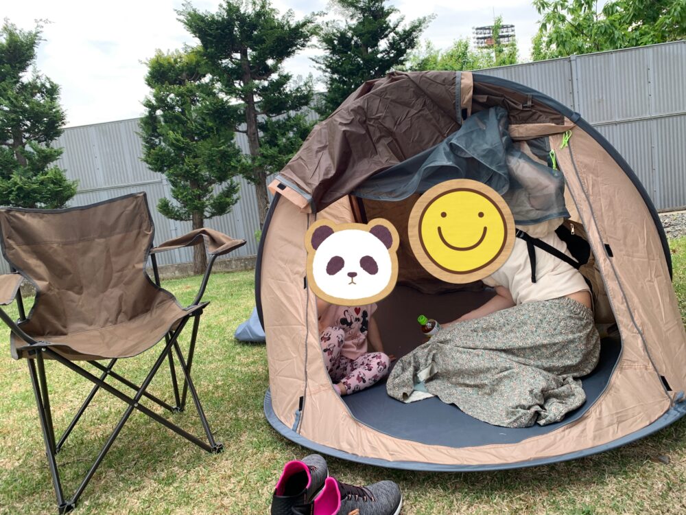 実際にkazooのポップアップテントを広げてみたイメージはこんな感じです。こうして改めて見ると、4人が入るというのは割とギリギリな感じがしますね。